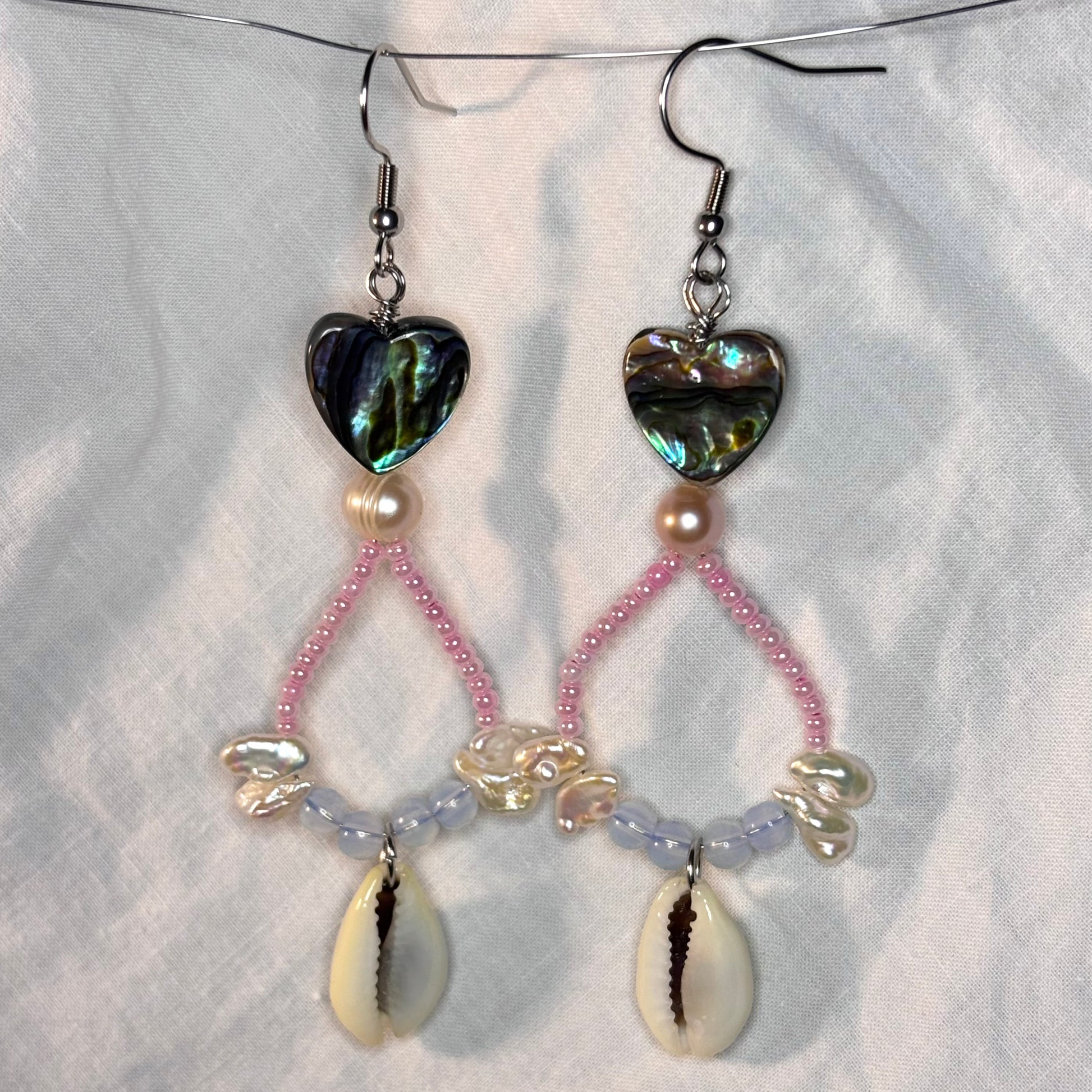 Earrings made with pearls, glass beads, cowrie shells, and abalone heart beads.